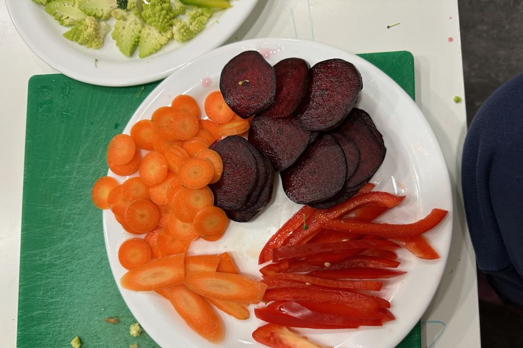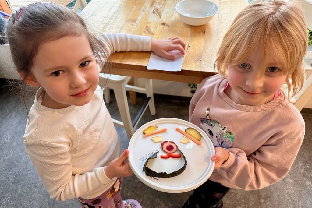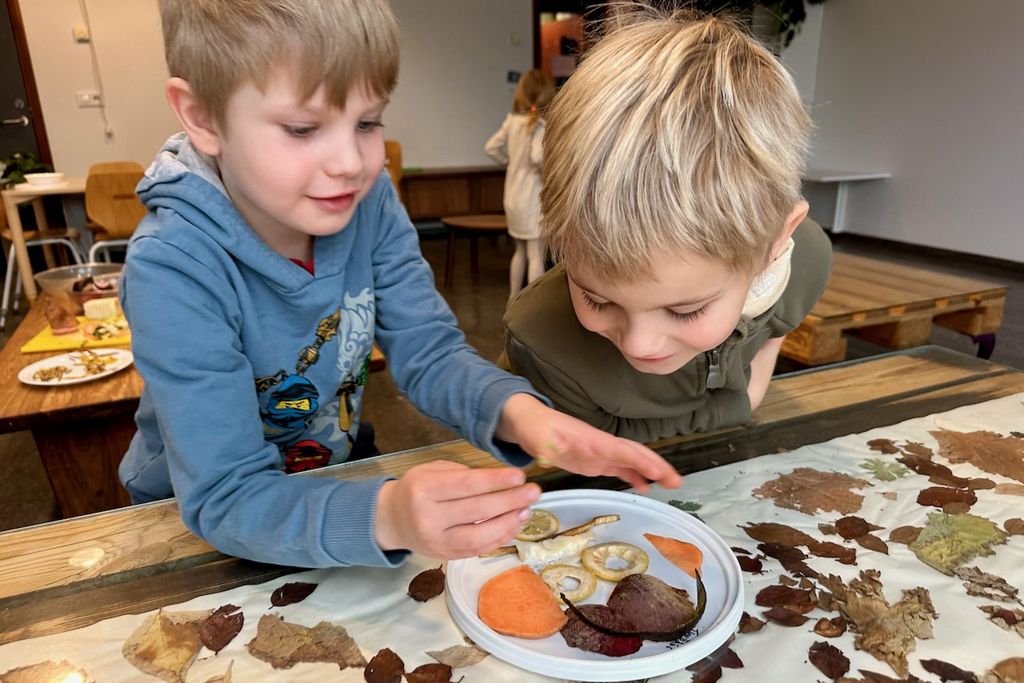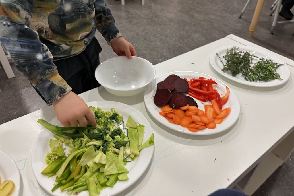 Við byrjuðum á að fara í eldhúsið og fengum þar ýmiss konar grænmeti og ávexti sem við skárum svo niður og röðuðum fallega á diska og í skálar. Börnin komu svo tvö og tvö saman og völdu sér þann efnivið sem þeim leist best á. Saman röðuðu þau grænmetinu sínu á stórt plastlok. Þau höfðu ekki neina fyrirmynd að miða við en það var athyglisvert að sjá að mörg þeirra ákváðu að búa til andlit.